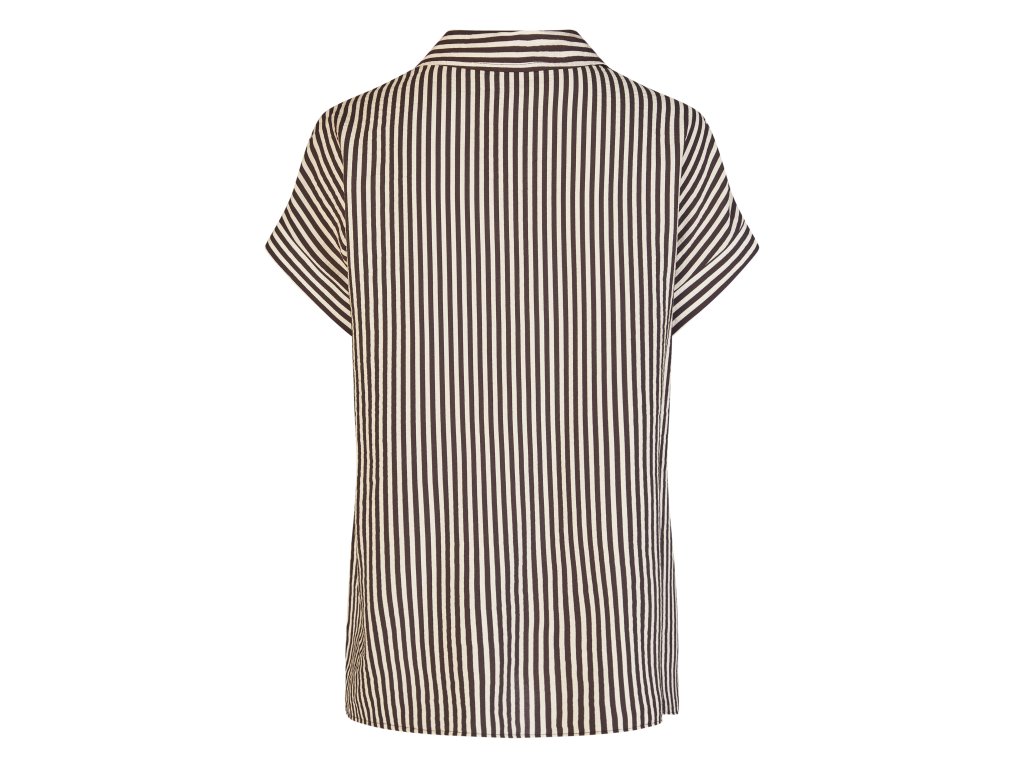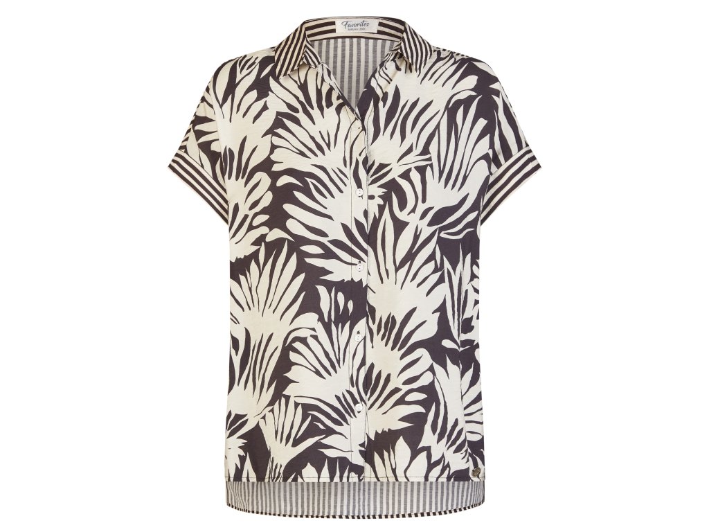 Blůza v černé a světlé krémové kombinaci se zapínáním na knoflíky. Přední část vyniká květovaným potiskem, zadní část je pruhovaná. Vyrobena z velmi jemné látky. Vhodná i teplého počasí. Ušita v rovném střihu. Přední část je kratší než zadní.