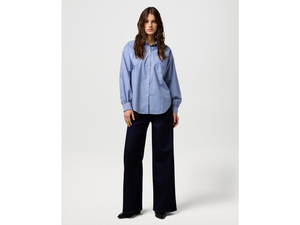 Temně modré džíny ve volném střihu. Mají vyšší sed, volné rozšiřující se nohavice, zapínání na zip. Mají klasických pět kapsesVynikají moderním střihem, světle modrou nadčasovou barvou a velmi příjemným materiálem. Na zadní pravé kapse je nášivka.
