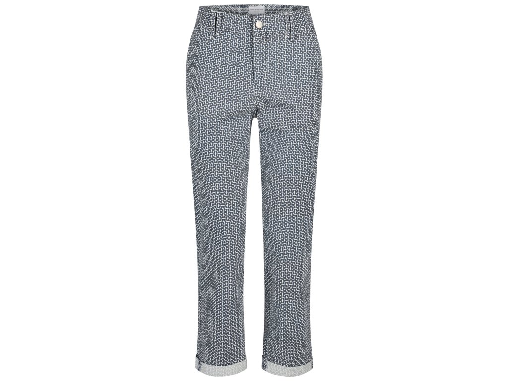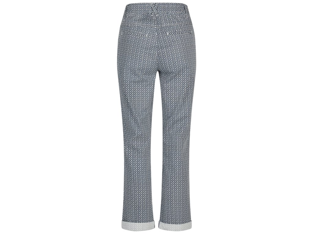 Dámské CHINO kalhoty se zešikmenými předními kapsami v bílé a modré kombinaci. Zadní kapsy jsou pouze ozdobné nikoli funkční. Zapínání na zip a knoflík. V mírně se zužující nohavici ve volnějším rovném střihu. Ušity v pohodlném a elegantním střihu. Vyrobeny z pružné látky (Flexi).