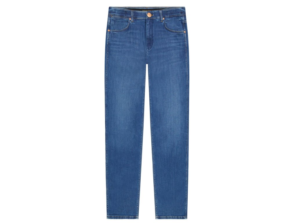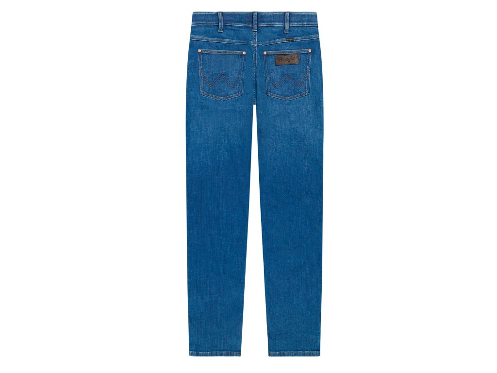 Středně modré džíny s jemným šoupáním, pěti kapsami, zapínáním na zip v klasickém rovném, moderním a pohodlném střihu GREENSBORO. Přední i zadní kapsy mají ozdobné nýty. Zapínání na zip a kovový knoflík s logem WRANGLER. Velmi povedená úprava, kterou si oblíbíte od prvního okamžiku. Zadní kapsy vynikají dvojitým prošitím ve tvaru W. Na pravé kapse je dále kožený štítek s logem WRANGLER.