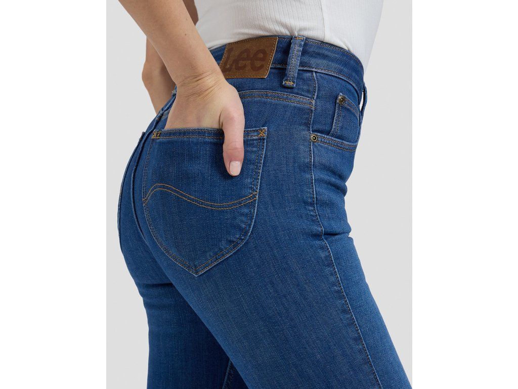 Středně modré džíny Lee do zvonu. Džíny s vysokým sedem, rovnou nohavicí ke kolenům a zvony od kolen dolu. Mají pět kapes a zapínání na zip. Vyrobeno s příměsí 2 % elastanu. Vynikají perfektním střihem a pohodlnou úpravou.
