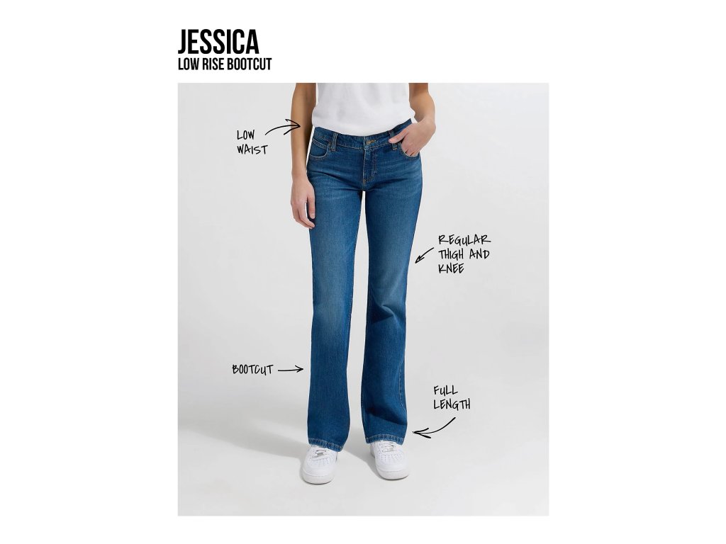 Popis střihu Jessica: Džíny mají nižší sed, klasické v oblasti boků a stehen, od kolen se rozšiřují.