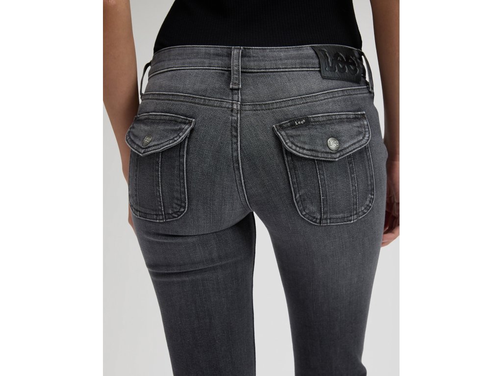 Dámské tmavě šedé džíny ve střihu FLAP POCKET od značky Lee. Mají rovný střih s mírným rozšířením do zvonu, nižší pozici sedu. Zadní strana vyniká kapsičkou se zapínáním na druk. Vyrobeny z odlehčené džínoviny.