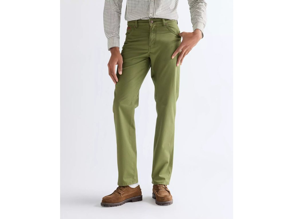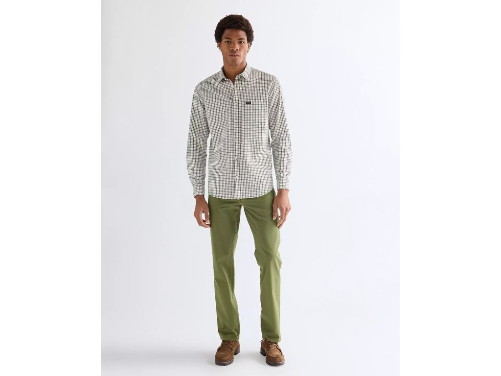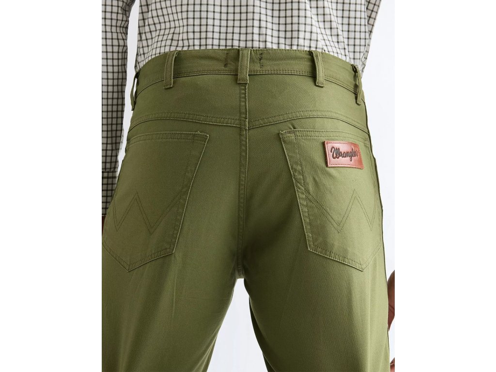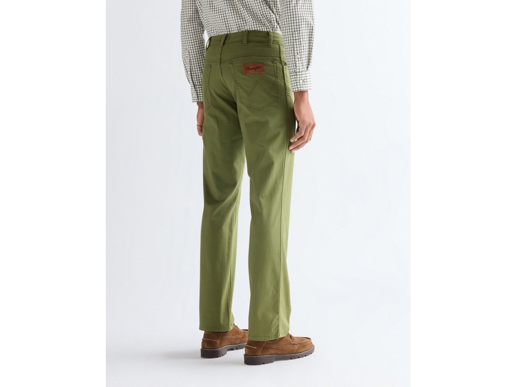 Kalhoty v zelené arvě v rovném střihu a se zapínáním na zip. Zapínání na zip s kovovým knoflíkem, na kterém je vyryto logo WRANGLER. Zadní kapsy mají typické dvojité prošití ve tvaru W. Na pravé zadní kapse je umístěn kožený štítek s logem WRANGLER. Vhodné jak do práce, tak na běžné nošení. V kombinaci s košilí či polem jednoznačně vyniknete.