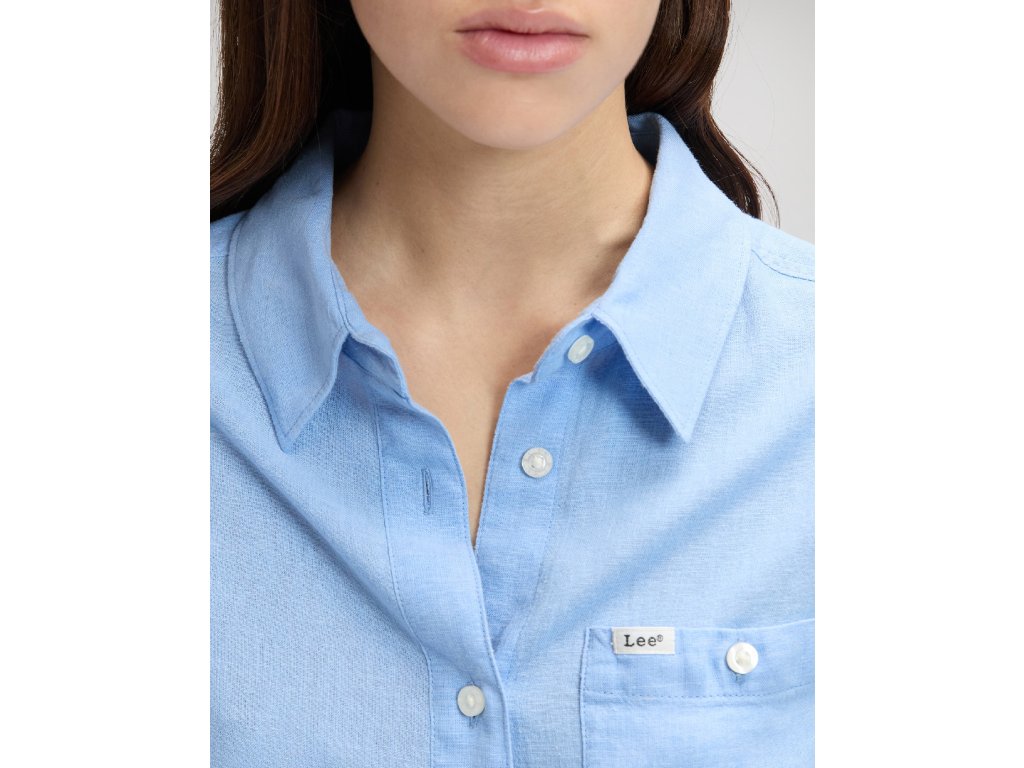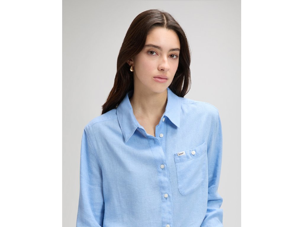Dámská lněná košile s dlouhým rukávem ve světle modré barvě. Zapínání na světlé knoflíky. Košile je vyrobena z 54 % lnu a 46 % viskózy. Ušita v mírně projmutém střihu REGULAR FIT. Košili vhodná k džínám i sukni.