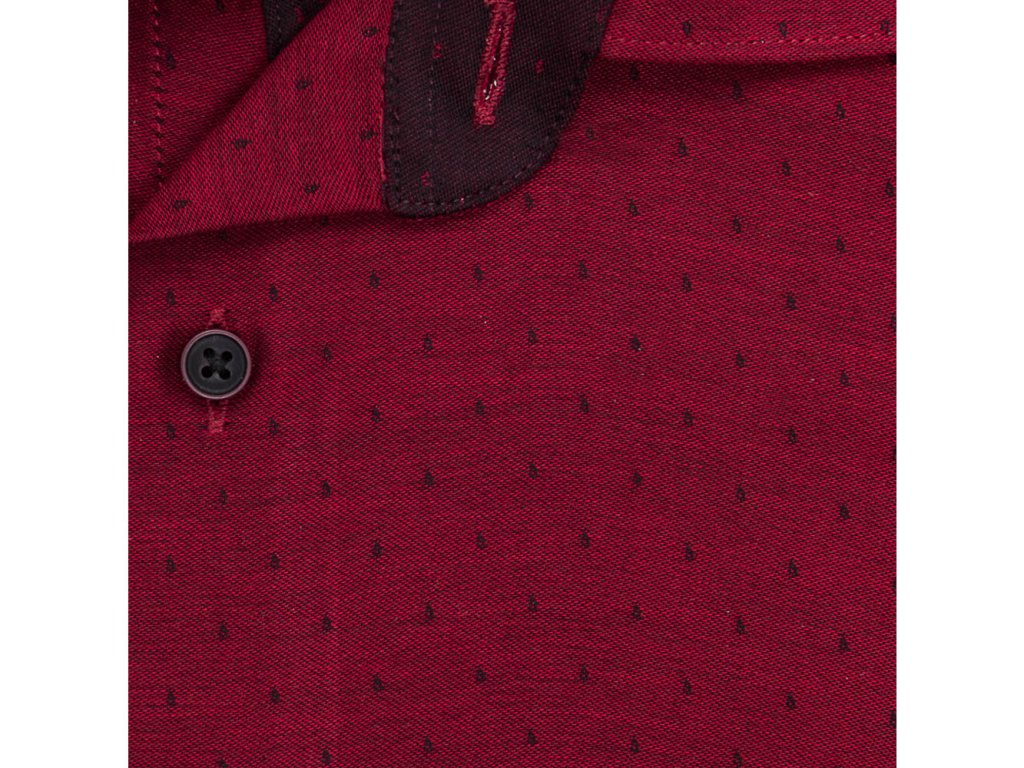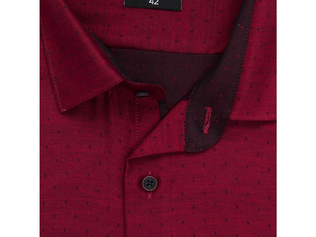 Společenská košile s dlouhým rukávem v prodloužené délce v užším střihu Slim Fit od značky AMJ. Košile ve vínové barvě s jemnými světlými tečkami. Zapínání na tmavě knoflíky s vínovým ohraničením. Košile bez kapsičky. Vnitřek límce je v odlišném barevném provedení. Má 60 % bavlny a 40 % polyesteru v úpravě EASY CARE.