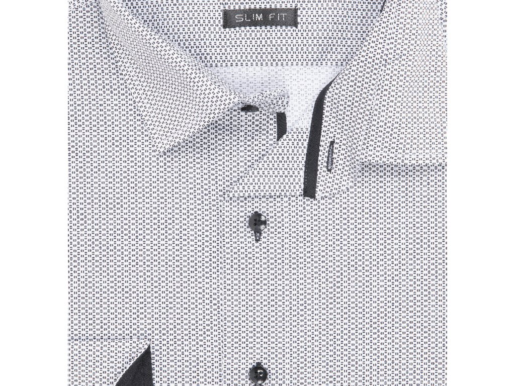 Společenská košile s dlouhým rukávem od značky AMJ v prvotřídní kolekci Lui Bentini. Košile v bílé barvě s černým vzorečkem. Ušita v užším střihu SLIM FIT. Zapínání na černé knoflíky. Ušita z 97 % bavlny a 3 % spandexu v úpravě EASY CARE.