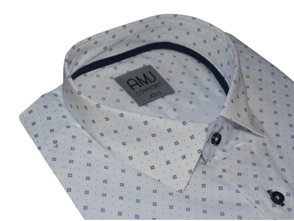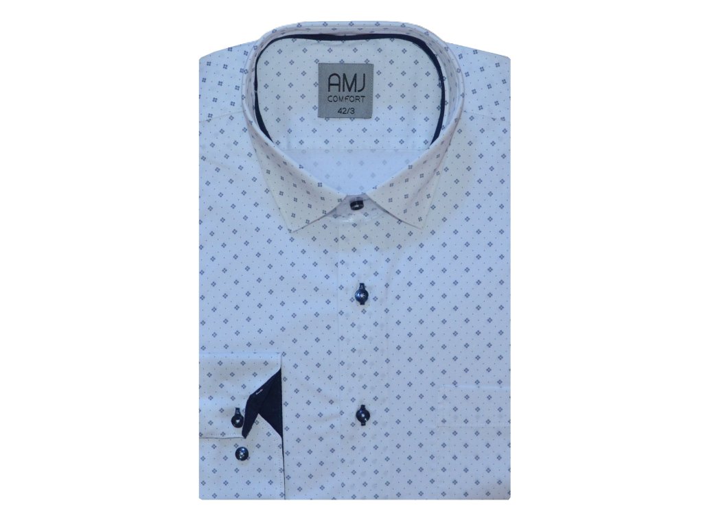 Společenská košile s dlouhým rukávem AMJ v klasickém rovném střihu. Košile v bílé barvě s modrým vzorečkem. Zapínání na tmavě modré knoflíčky. Má kapsičku na levé straně hrudi. Ušita z komfortního materiálu z 95 % bavlny a 5 % spandexu v úpravě EASY CARE. Košile v prodloužené délce na výšku postavy cca 188-194 cm.