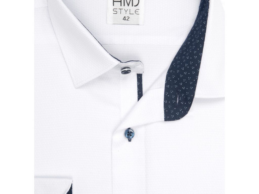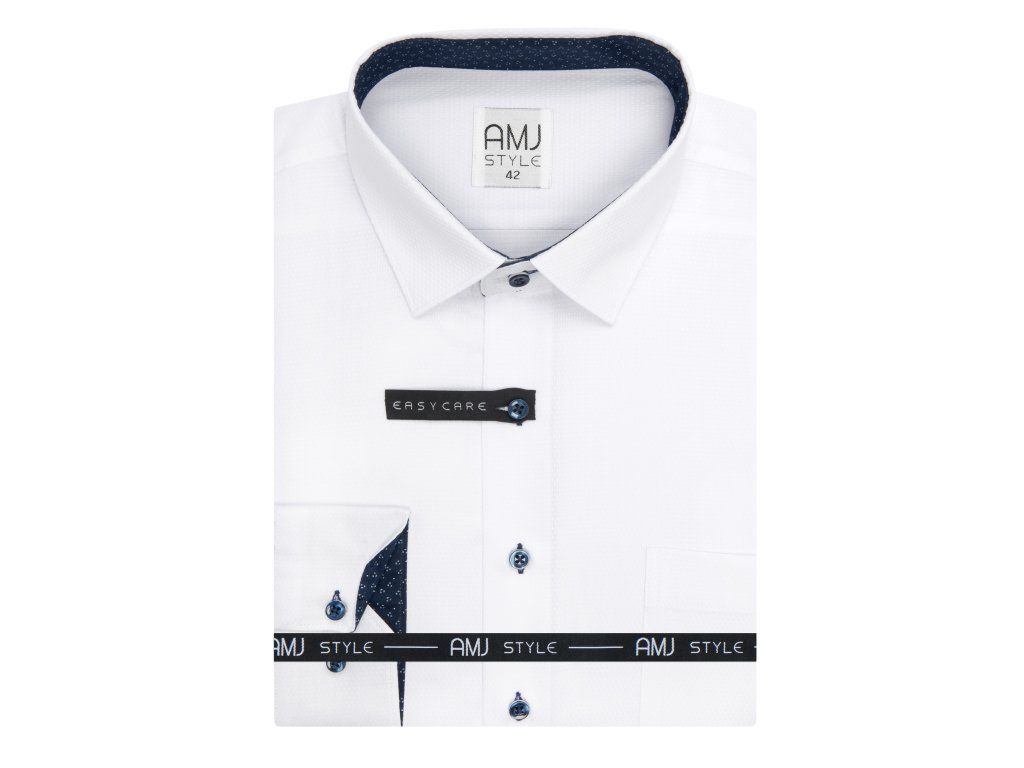 Společenská košile s dlouhým rukávem AMJ v klasickém rovném střihu. Košile v bílé barvě s jemnou strukturou v barvě košile. Má otevřenou kapsičky na levé straně hrudi. Zapínání na modré knoflíčky. Má 60 % bavlny a 40 % polyesteru v úpravě EASY CARE. Zapínání rukávů na klasický knoflík.