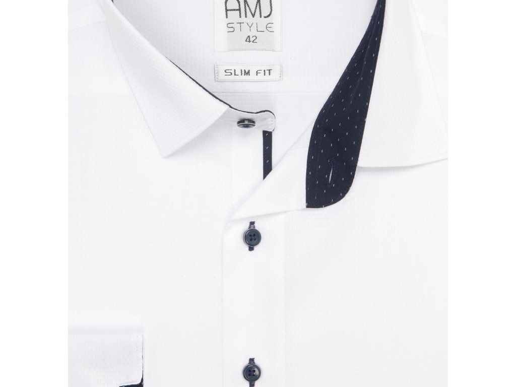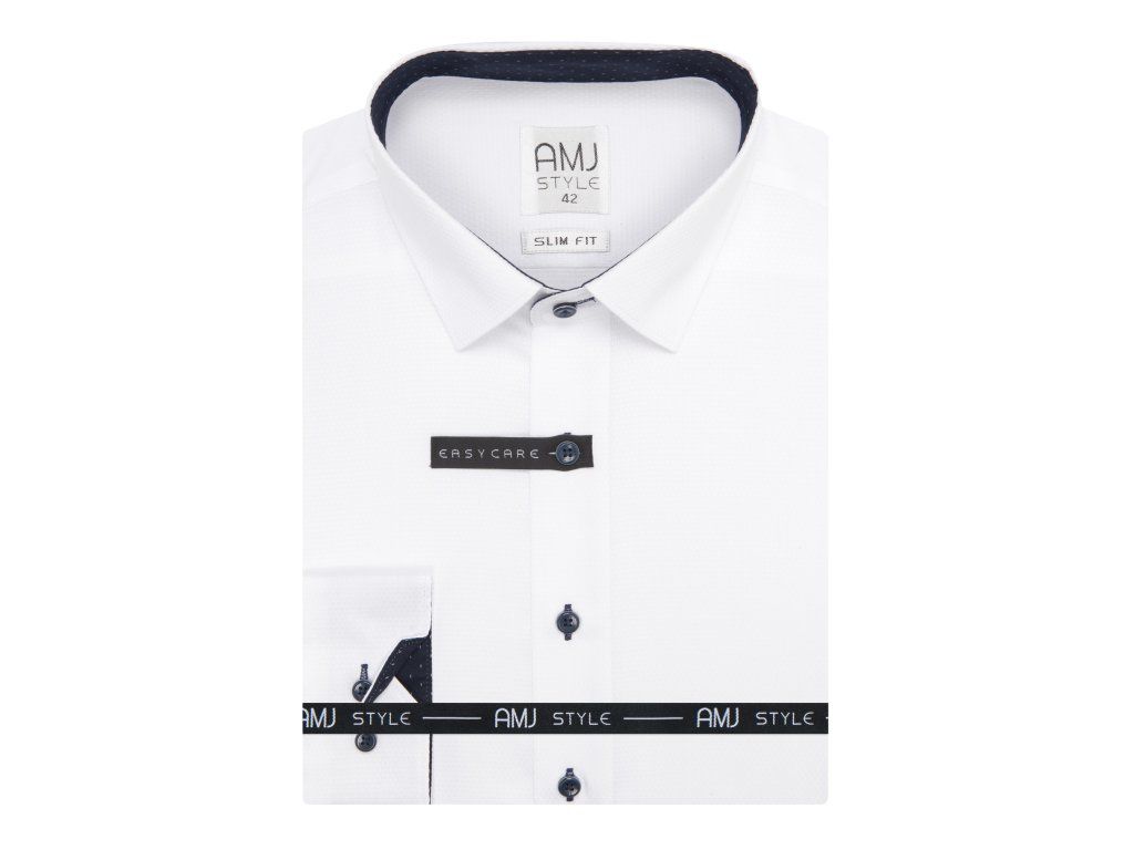 Společenská košile s dlouhým rukávem AMJ v užší střihu SLIM FIT. Košile v bílé barvě s jemnou strukturou. Košile bez kapsičky. Zapínání na modré knoflíky. Košile má modré detaily. Má 60 % bavlny a 40 % polyesteru. Zapínání rukávů na klasický knoflík.