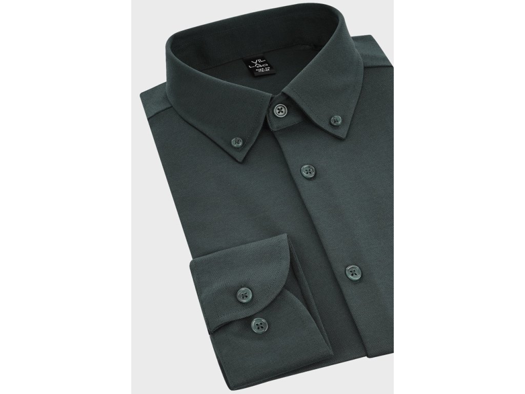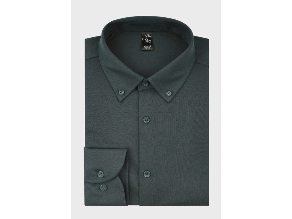 Společenská košile s dlouhým rukávem od značky MMER. Košile v tmavé lahvově zelené barvě. Jednobarevn košile s knoflíky v barvě košile. Má raglánový střih. Košile bez kapsičky v užším Slim fit střihu. Ušita z pružné látky.