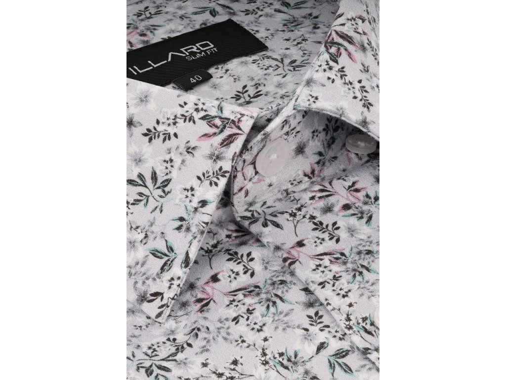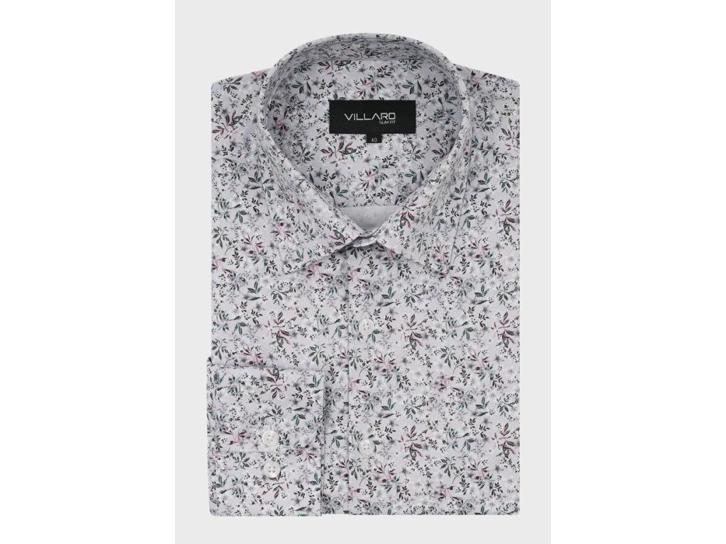 Společenská košile s dlouhým rukávem od značky VILLARO by MMER. Košile se světle šedým podkladem a květovaným vzorem v růžové, tyrkysové, bílé a černé barvě. Košile se zapínáním na světlé knoflíky. Ušita z 97 % bavlny a 3 % elastanu. Zapínání rukávů na klasický knoflík. Ušita ve střihu Slim Fit.