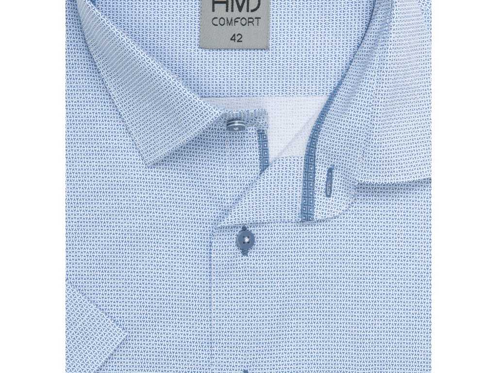 Společenská košile s krátkým rukávem AMJ v klasickém rovném střihu. Košile ve světle modré barvě s jemným světlým vzorečkem. Zapínání na knoflíky v modrém odstínu košile. Má kapsičku na levé straně hrudi. Ušita z příjemného a komfortního materiálu z 95 % bavlny a 5 % spandexu v úpravě EASY CARE, která zajistí snadné žehlení.