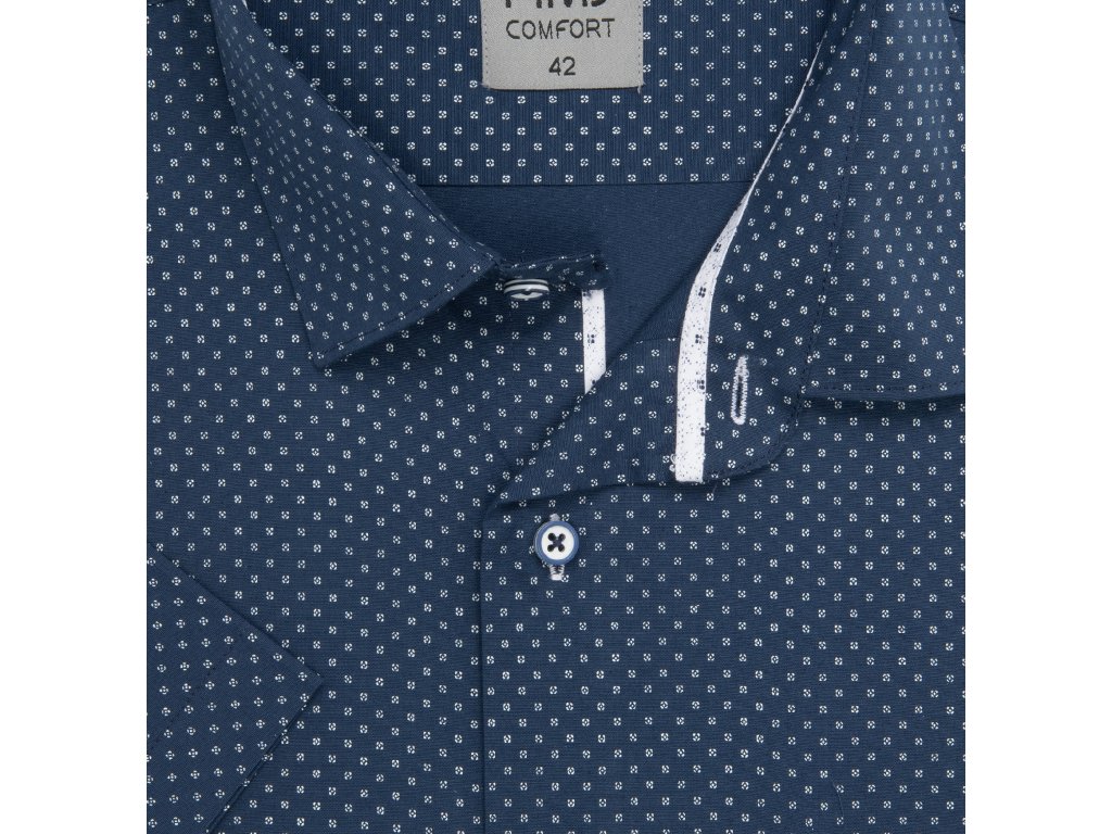 Společenská košile s krátkým rukávem AMJ v klasickém rovném střihu. Košile v tmavě modré barvě s jemným světlým vzorečkem. Zapínání na knoflíky s bílým středem a modrým ohraničením. Má kapsičku na levé straně hrudi. Ušita z příjemného a komfortního materiálu z 95 % bavlny a 5 % spandexu v úpravě EASY CARE, která zajistí snadné žehlení.