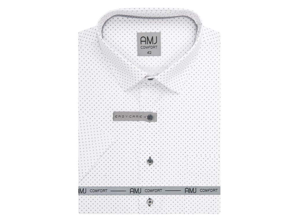 Společenská košile s krátkým rukávem AMJ v klasickém rovném střihu. Košile v bílé barvě s jemným šedým vzorečkem. Má propracované barevné detaily. Zapínání na šedé knoflíky. Má kapsičku na levé straně hrudi. Ušita z příjemného a komfortního materiálu z 95 % bavlny a 5 % spandexu v úpravě EASY CARE, která zajistí snadné žehlení.