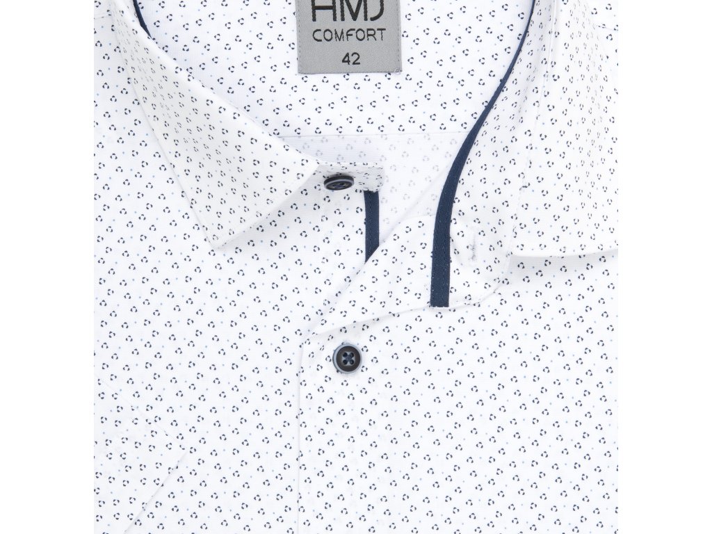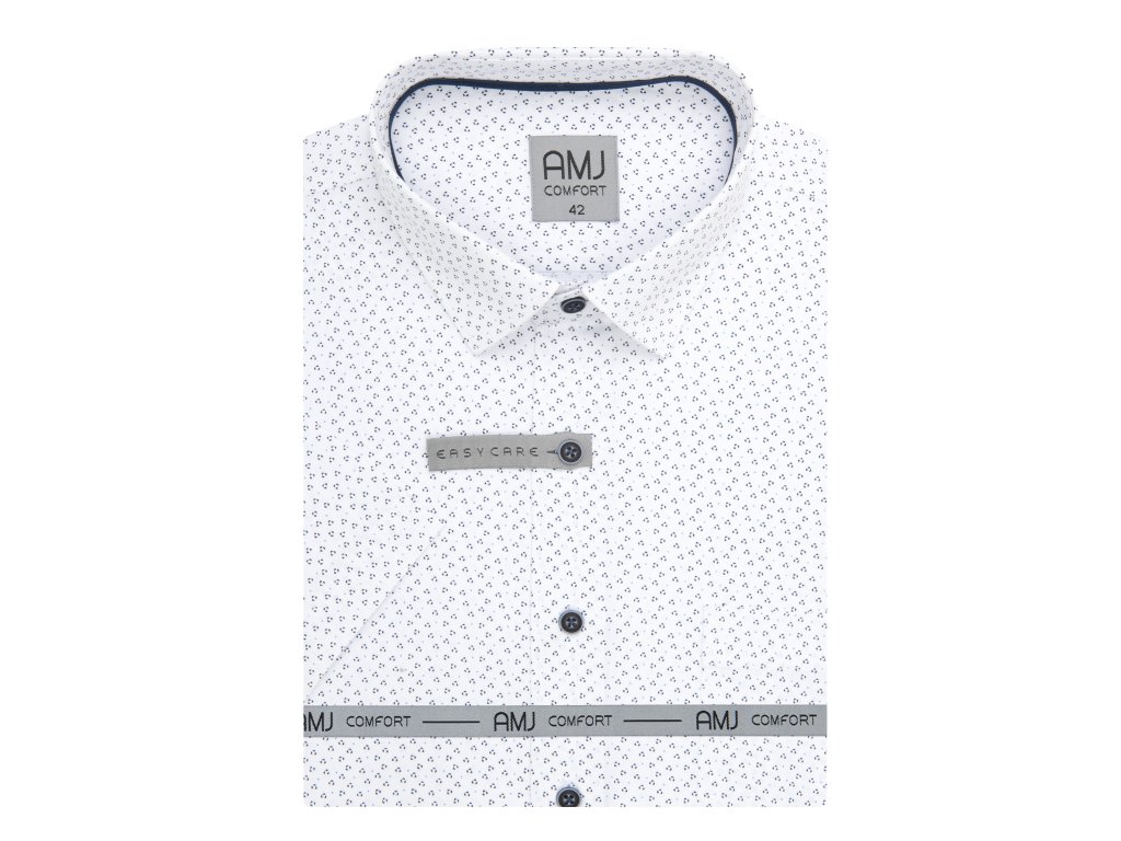 Společenská košile s krátkým rukávem AMJ v klasickém rovném střihu. Košile v bílé barvě s jemným modrým morečkem. Má propracované barevné detaily v modré barvě. Zapínání na modré knoflíky. Má kapsičku na levé straně hrudi. Ušita z příjemného a komfortního materiálu z 95 % bavlny a 5 % spandexu v úpravě EASY CARE, která zajistí snadné žehlení.