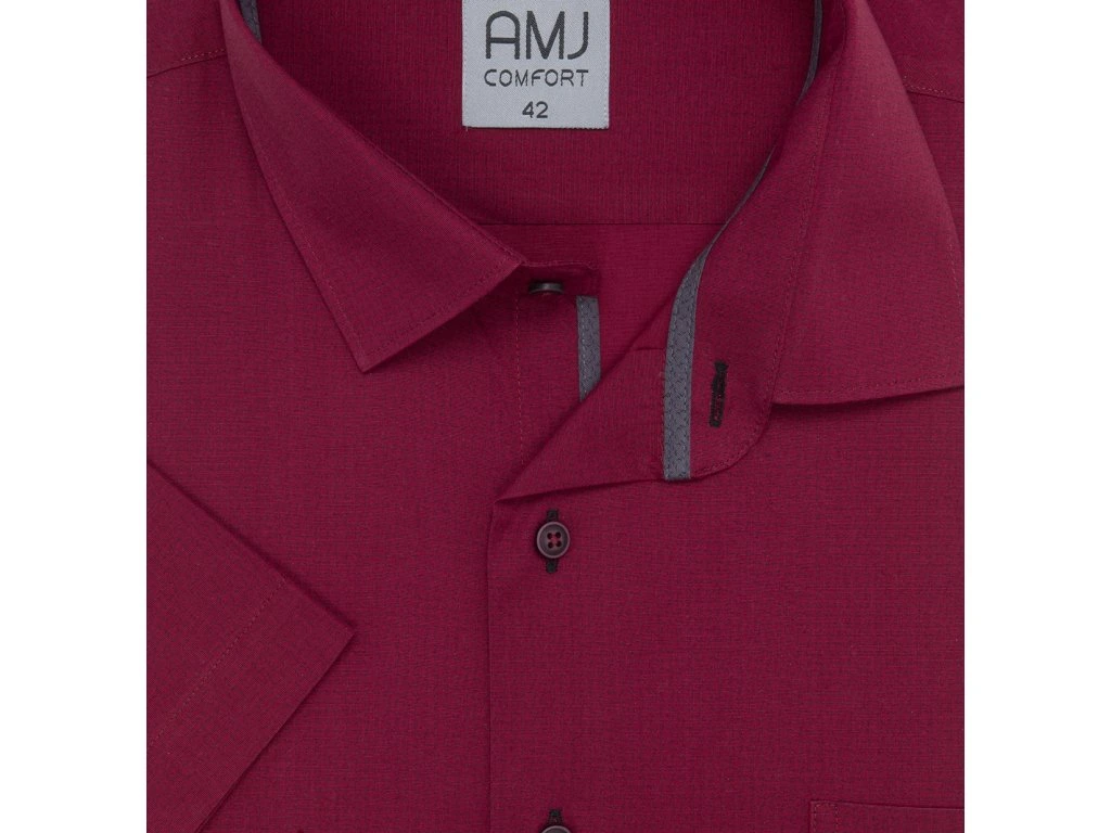 Společenská košile s krátkým rukávem AMJ v klasickém rovném střihu. Košile ve vínové barvě s velmi drobným tmavším vzorečkem. Zapínání na vínové knoflíky. Má kapsičku na levé straně hrudi. Košile je vhodná do obleku pod sako ale také ke kalhotám a volnočasovémým kalhotám a saku. Ušita z příjemného a komfortního materiálu z 95 % bavlny a 5 % spandexu v úpravě EASY CARE, která zajistí snadné žehlení.