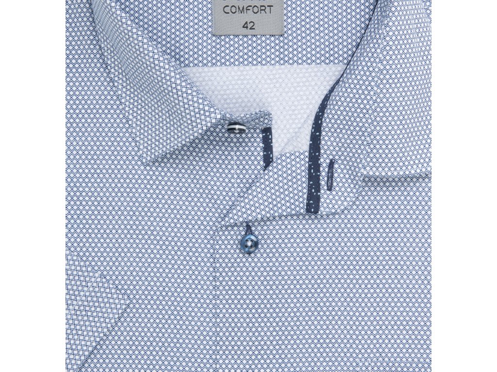 Společenská košile s krátkým rukávem AMJ v užším projmutém střihu SLIM FIT. Košile ve světle modré barvě s jemným světlým vzorečkem. Má propracované barevné detaily. Zapínání na tmavě knoflíky se světlým ohraničením. Bez kapsičky. Ušita z příjemného a komfortního materiálu z 95 % bavlny a 5 % spandexu v úpravě EASY CARE, která zajistí snadné žehlení.