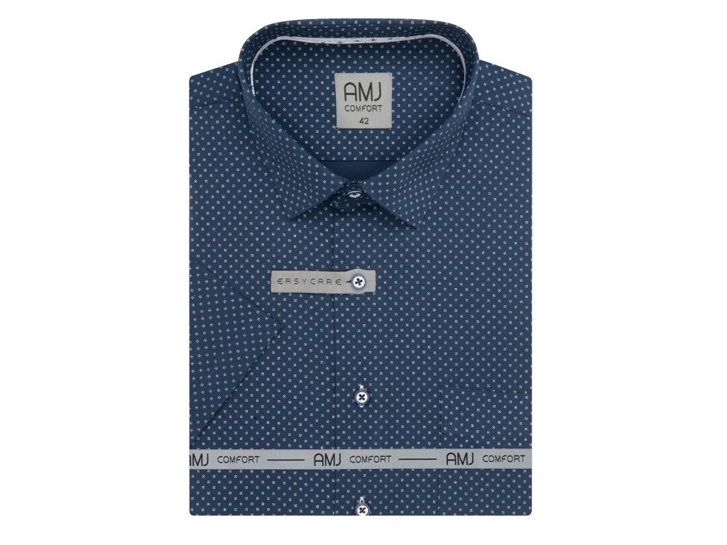 Společenská košile s krátkým rukávem AMJ v užším projmutém střihu SLIM FIT. Košile v tmavě modré barvě s jemným světlým vzorečkem. Má propracované barevné detaily. Zapínání na modré knoflíky s tmavým ohraničením. Bez kapsičky. Ušita z příjemného a komfortního materiálu z 95 % bavlny a 5 % spandexu v úpravě EASY CARE, která zajistí snadné žehlení.
