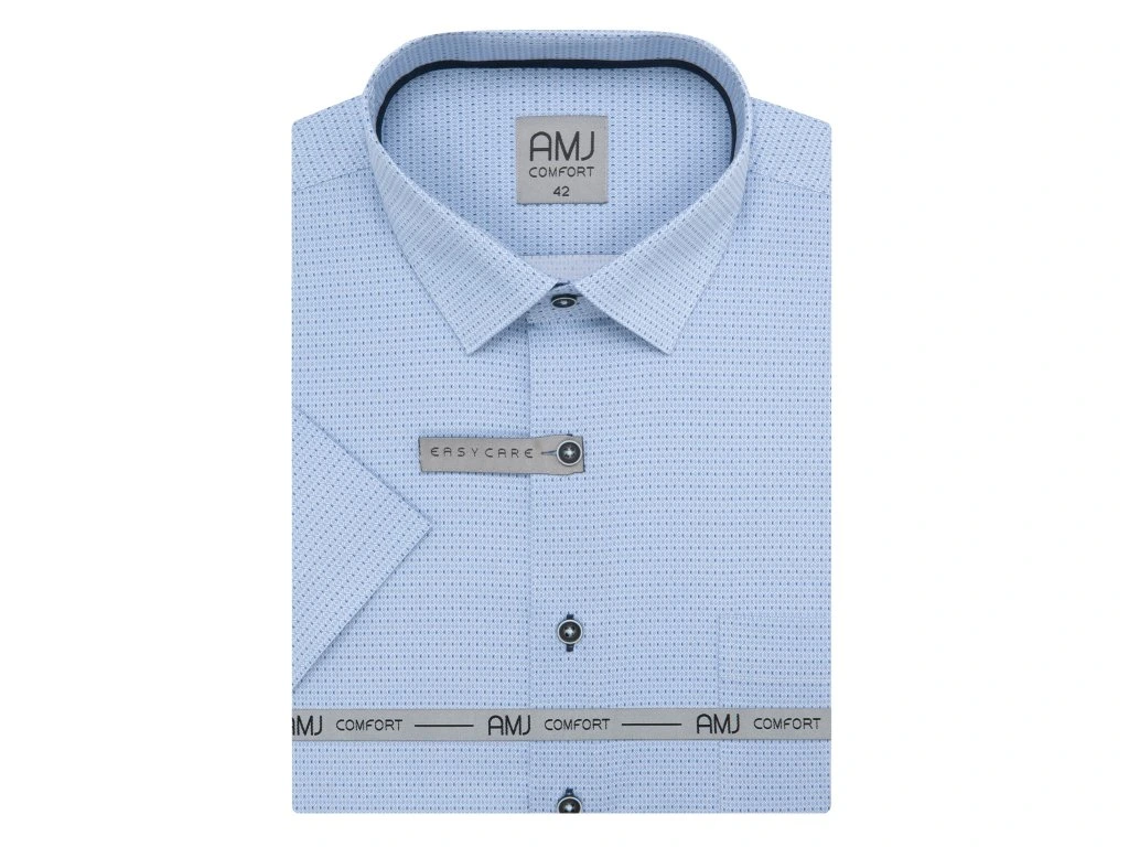 Společenská košile s krátkým rukávem AMJ v užším projmutém střihu SLIM FIT. Košile ve světle modré barvě s jemným světlým vzorečkem. Má propracované barevné detaily. Zapínání na tmavě knoflíky se světlým ohraničením. Bez kapsičky. Ušita z příjemného a komfortního materiálu z 95 % bavlny a 5 % spandexu v úpravě EASY CARE, která zajistí snadné žehlení.