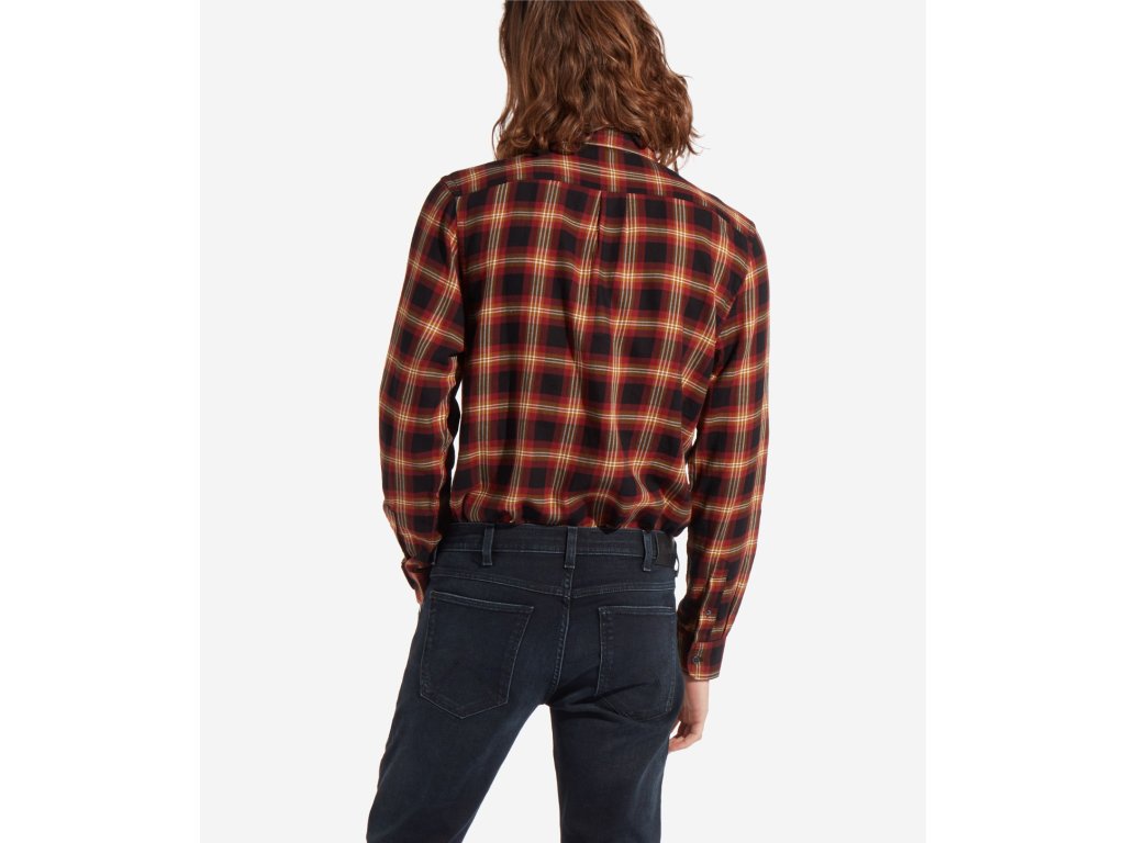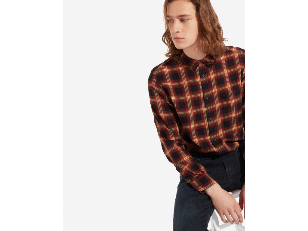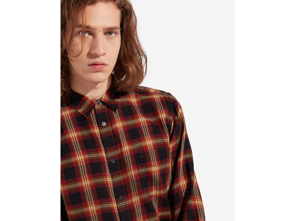 Košile v tlumených tónech červené, béžové a černé barvě. Má jednu otevřenou kapsičku a zapínání na černé knoflíky. Na kapsičce je vyšit symbol W v černé barvě. Má kulatý dolní lem a sklady na zadní straně.