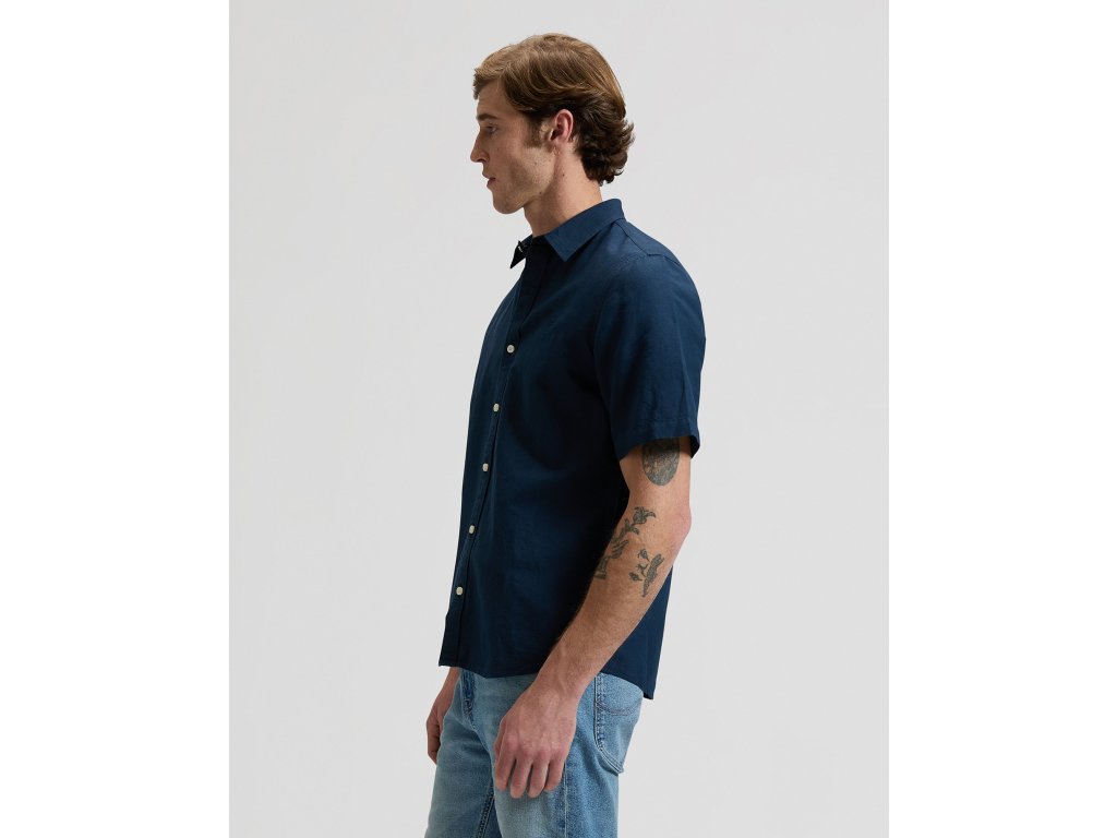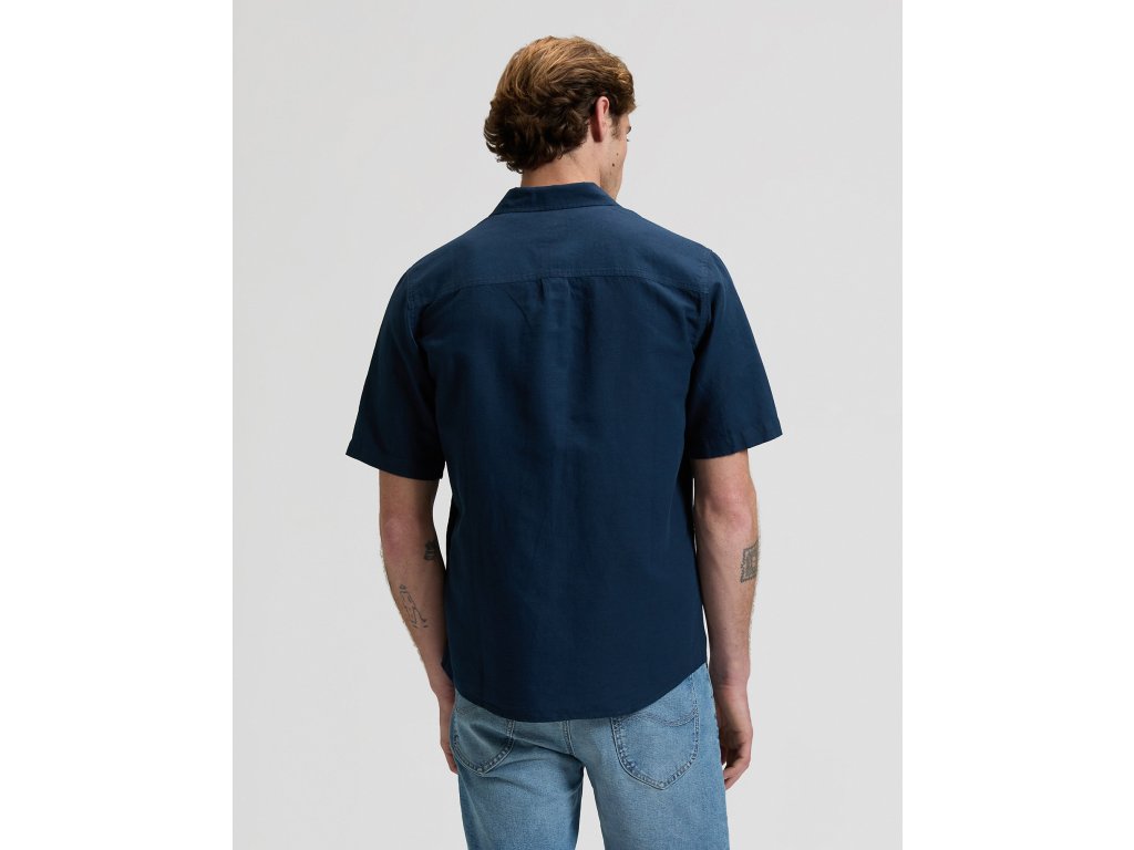 Lněná košile s krátkým rukávem v tmavě modré barvě se zapínáním na bílé knoflíky. Ušita v mírně projmutém střihu Regular Fit. Vyrobena z 55 % lnu a 45 % bavlny.