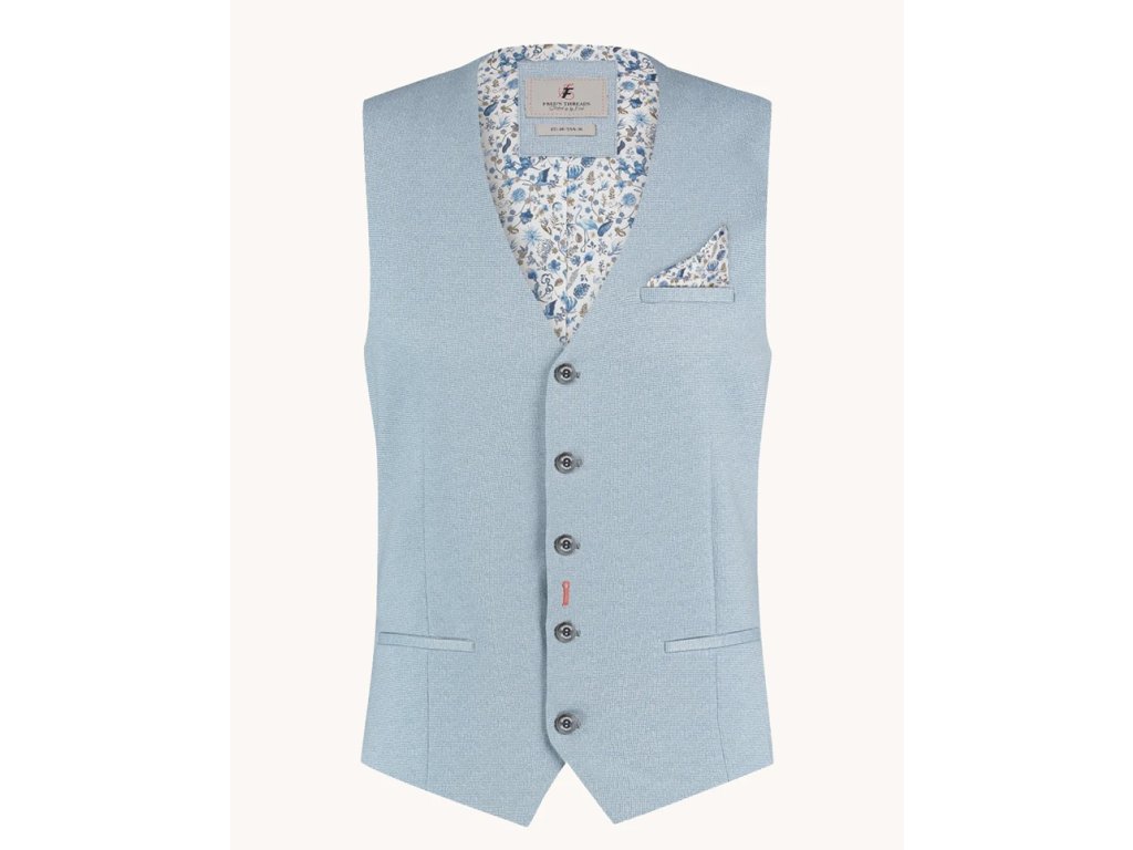 Společenská vesta ve světle modré barvě s jemným decentním vzorečkem. Vesta v prvotřídní kvalitě od značky A FISH NAMED FRED.