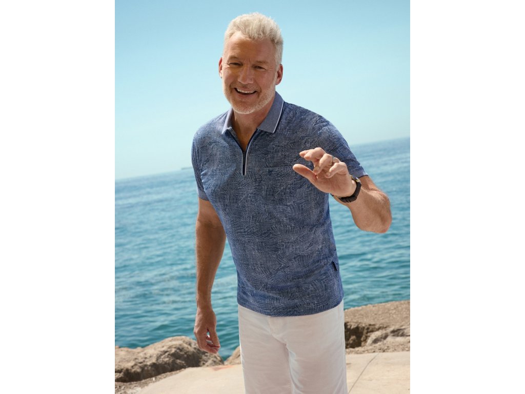 Tričko s límečkem v tmavě modré barvě s bílým vzorem ve formě rostlin. Má zapínání na zip a otevřenou kapsičku na hrudi. Vyrobeno z velmi příjemného a kvalitního materiálu v úpravě STAY FRESH (prodyšný materiál, který odvádí pot).