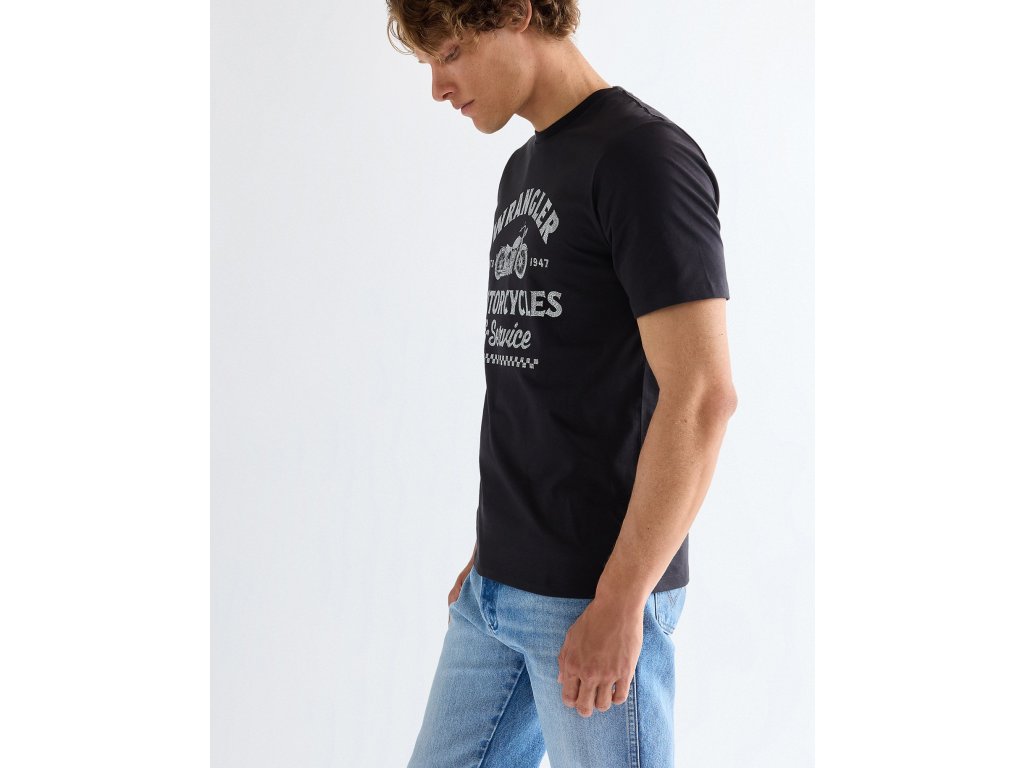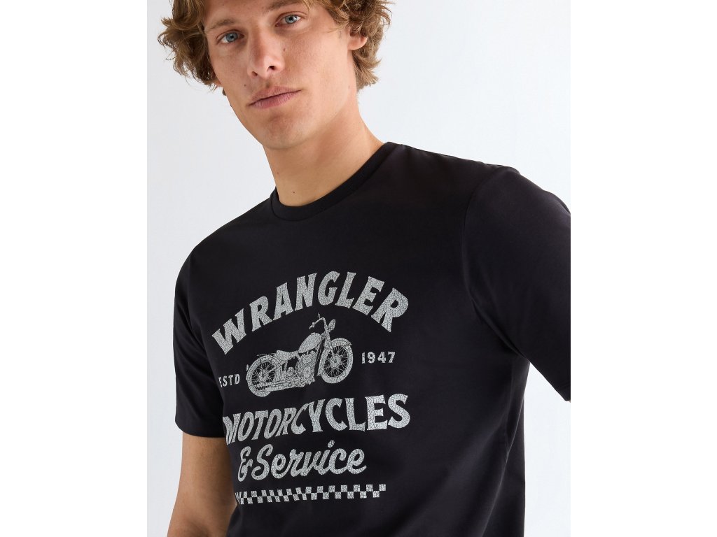 Černé tričko s krátkým rukávem a potiskem v bílé barvě. Ušito v mírně vypasovaném střihu REGULAR FIT. Ušito ze 100 % bavlny. Tričko s logem Wrangler a motorkou.